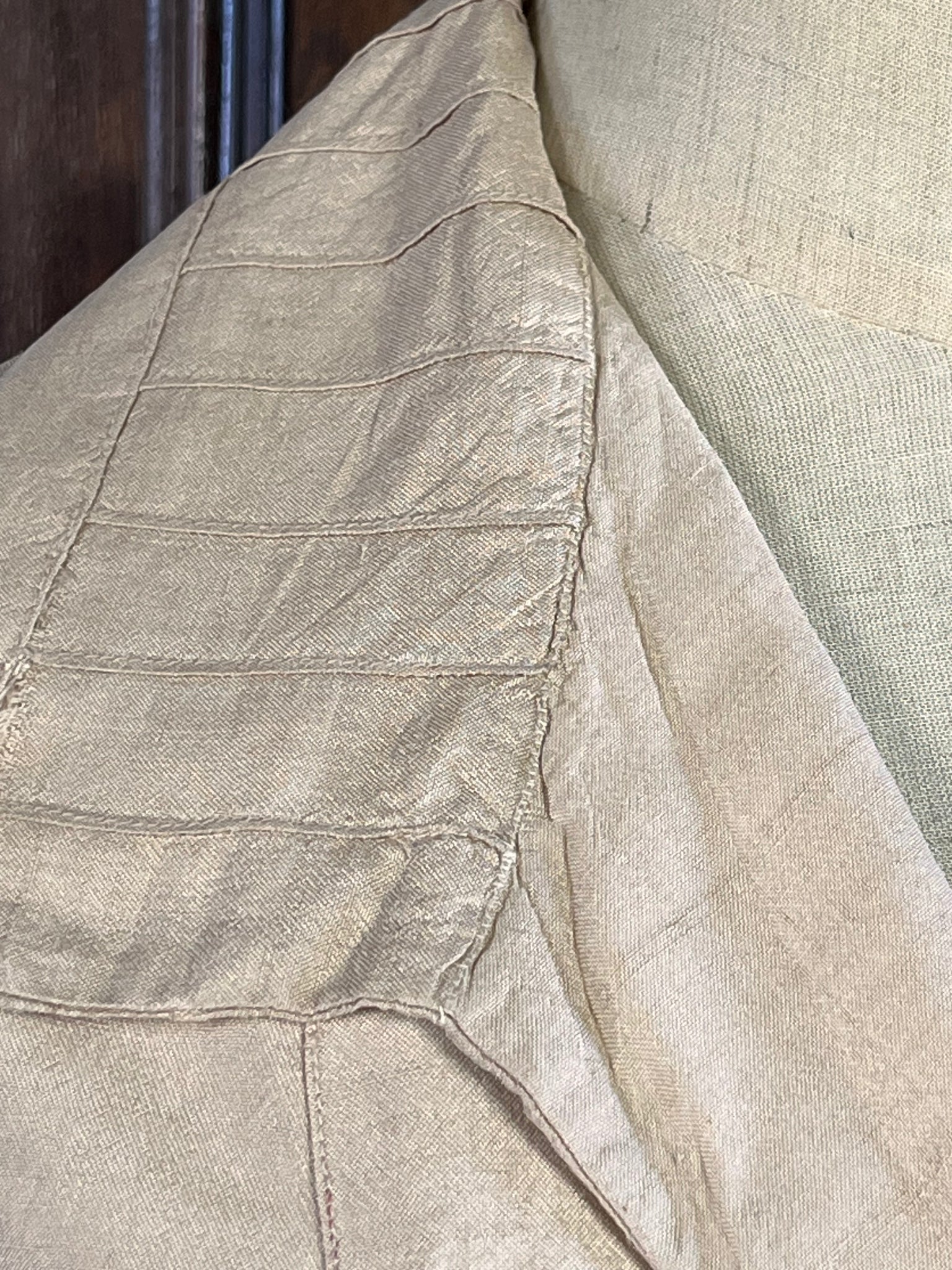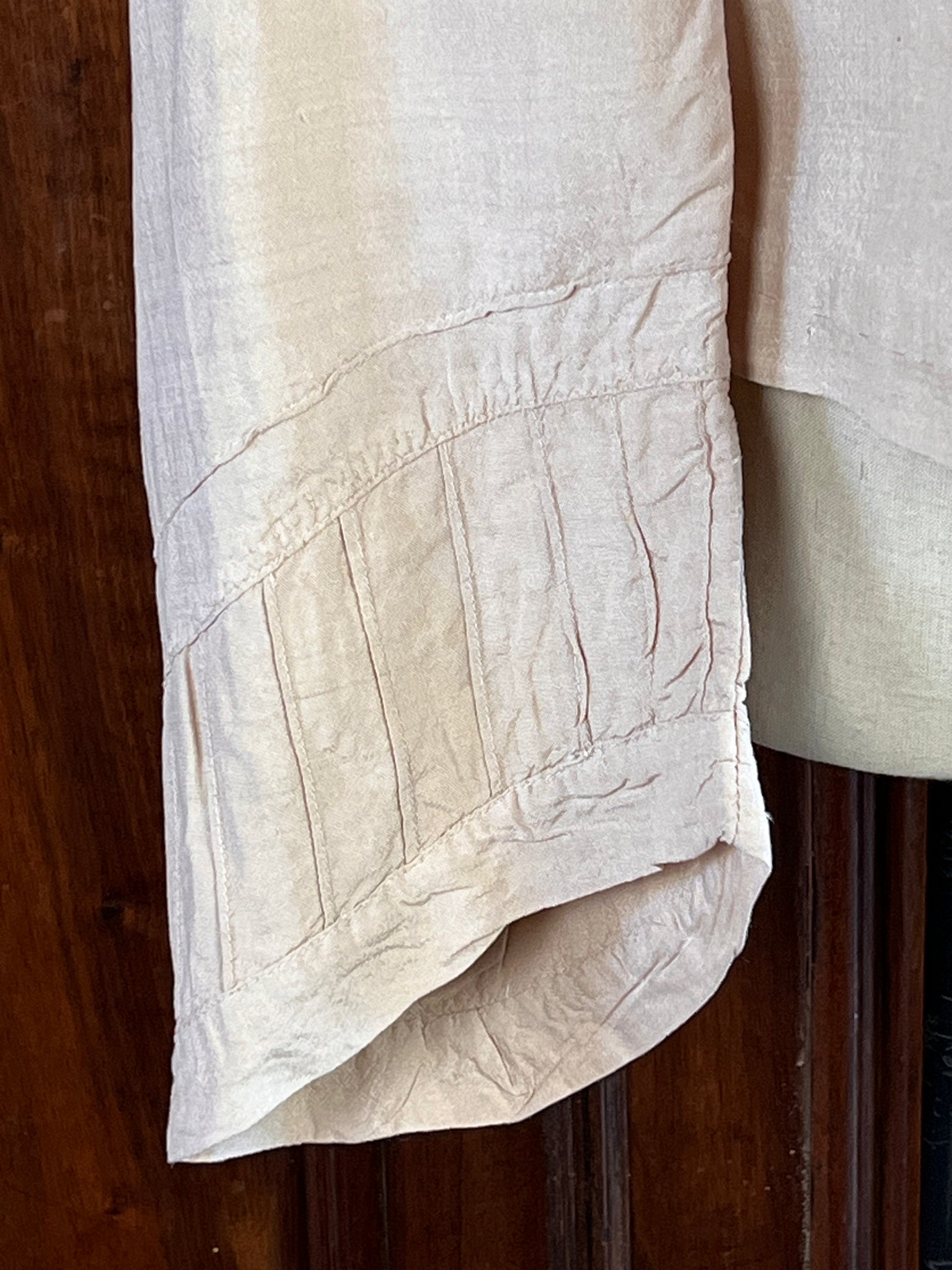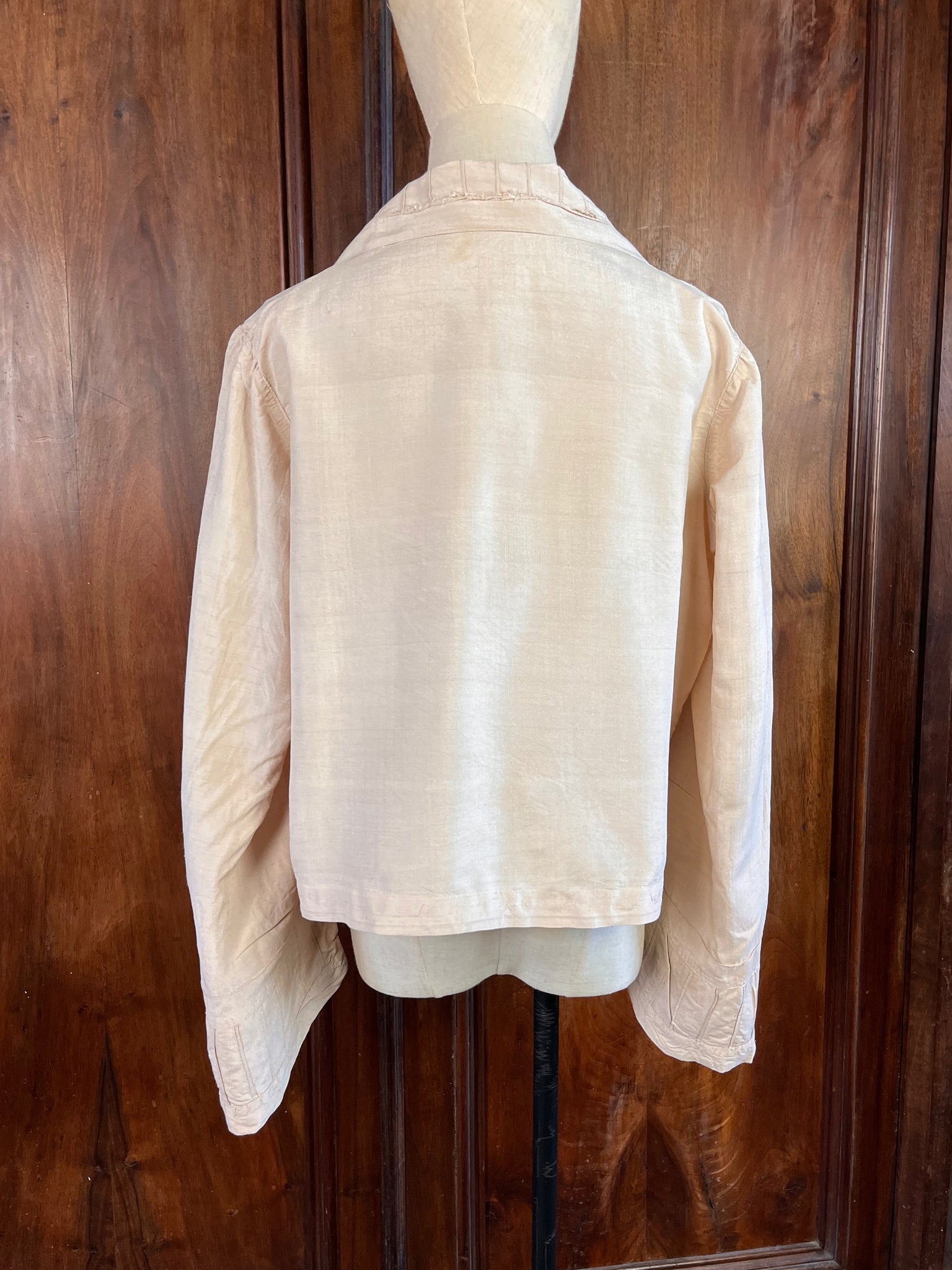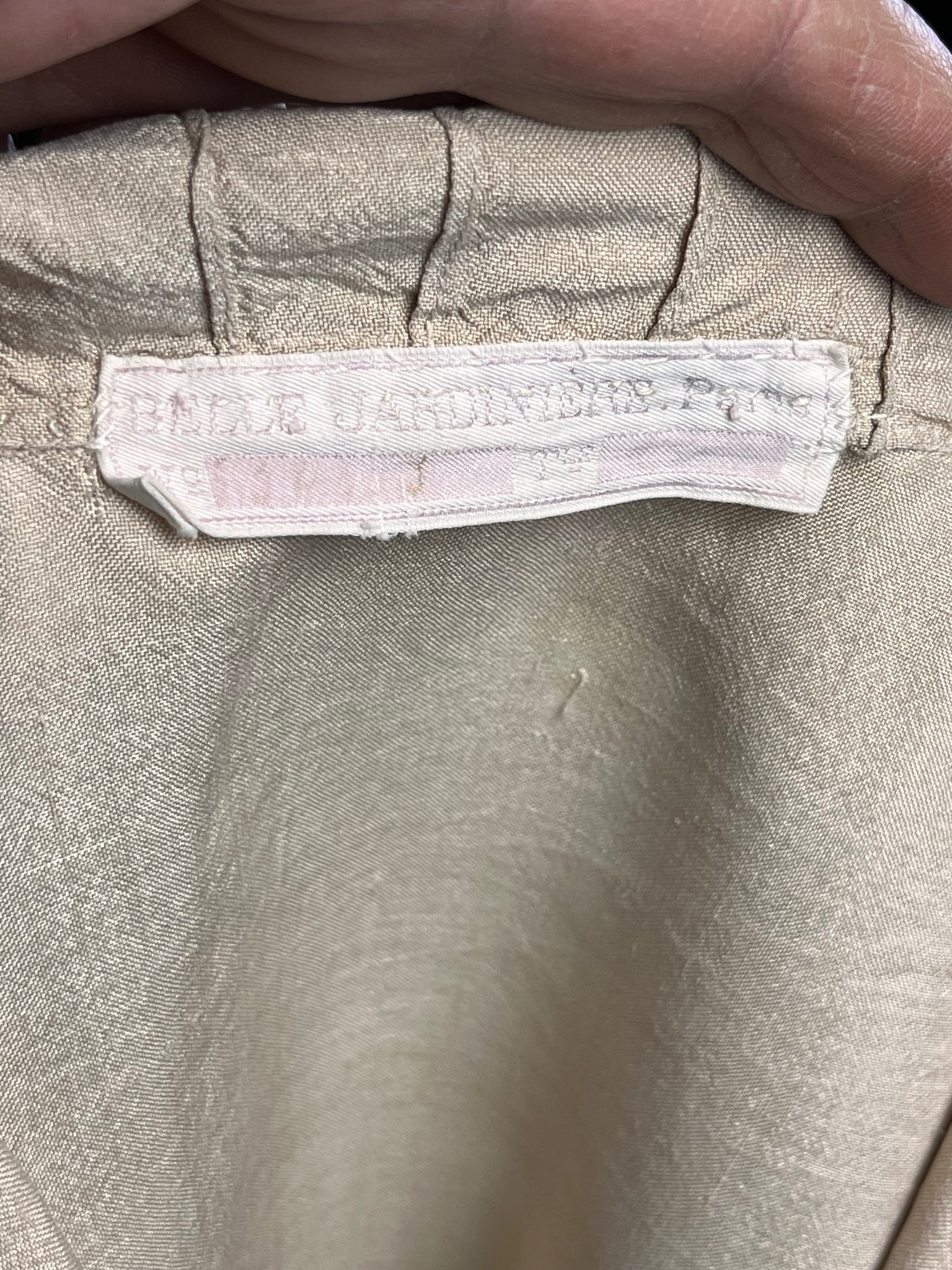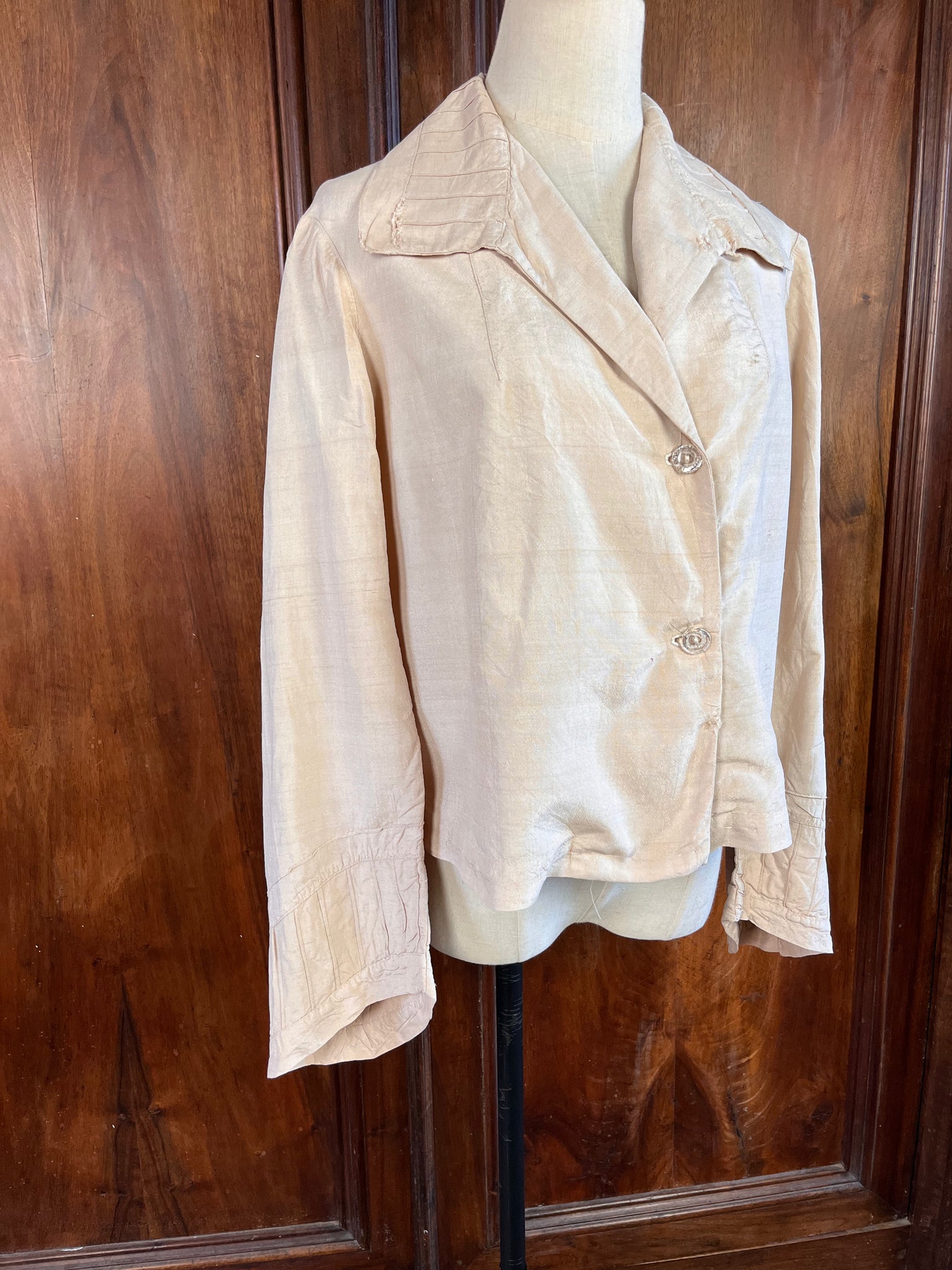 Chemisier années 20 en soie sauvage de la marque " La belle Jardinière ". Grand col large agrémenté de plis cousus, Deux boutons en verre sur le devant. Les manches sont évasées et elles aussi ornées de plis cousus au niveai des poignets.