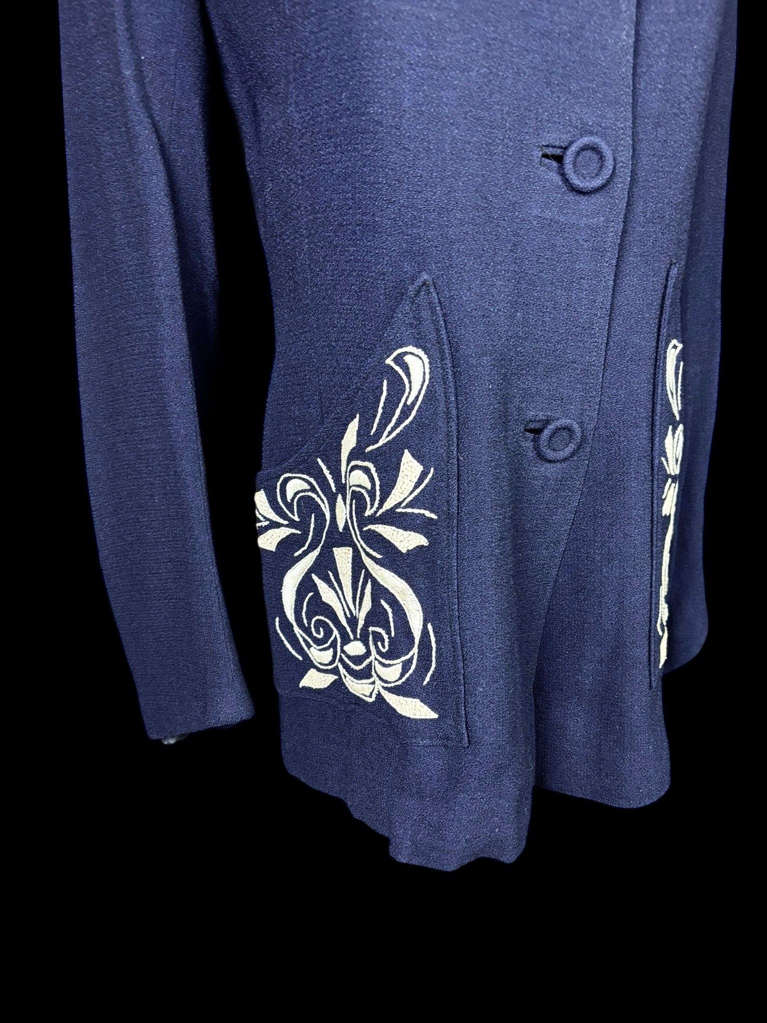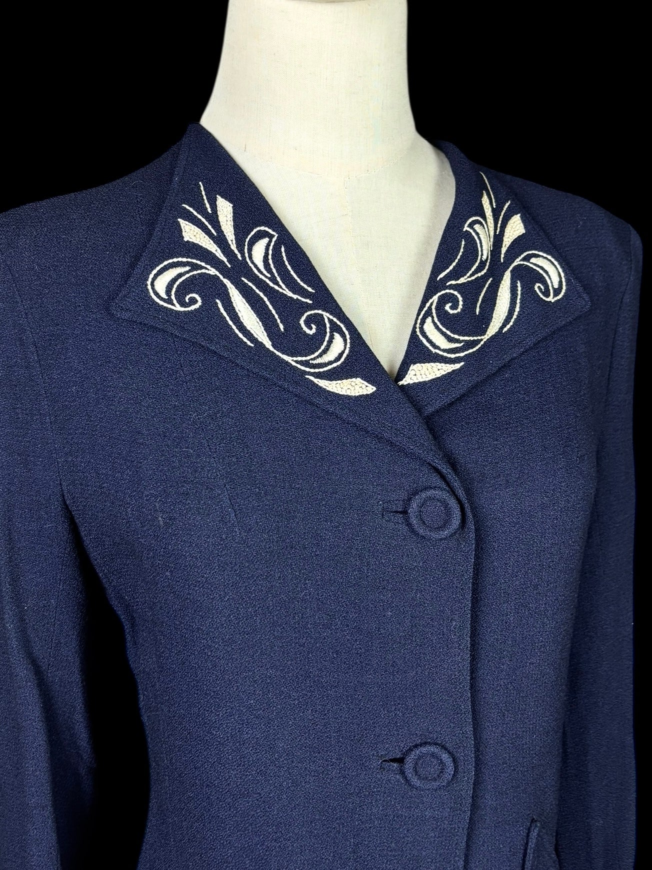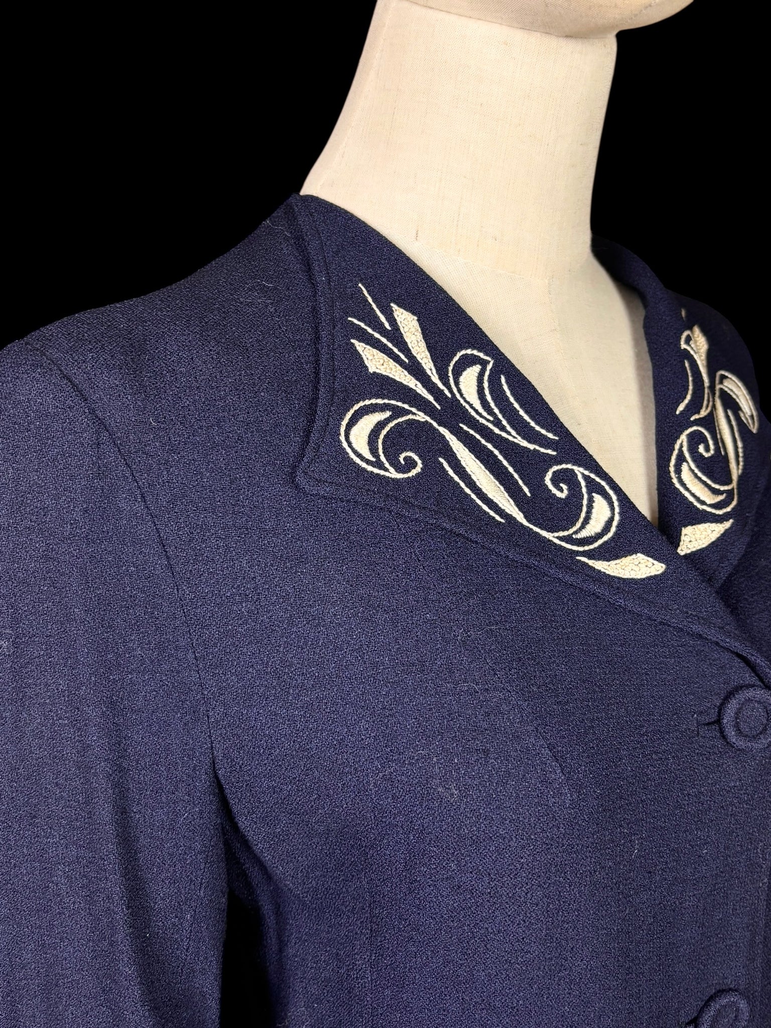 Veste années 40 faite dans un lainage bleu marine et dont le col et les poches sont brodés de coton de soie blanc. Boutons recouverts sur le devant. Très joli travail de pinces dans la ceinture au dos.