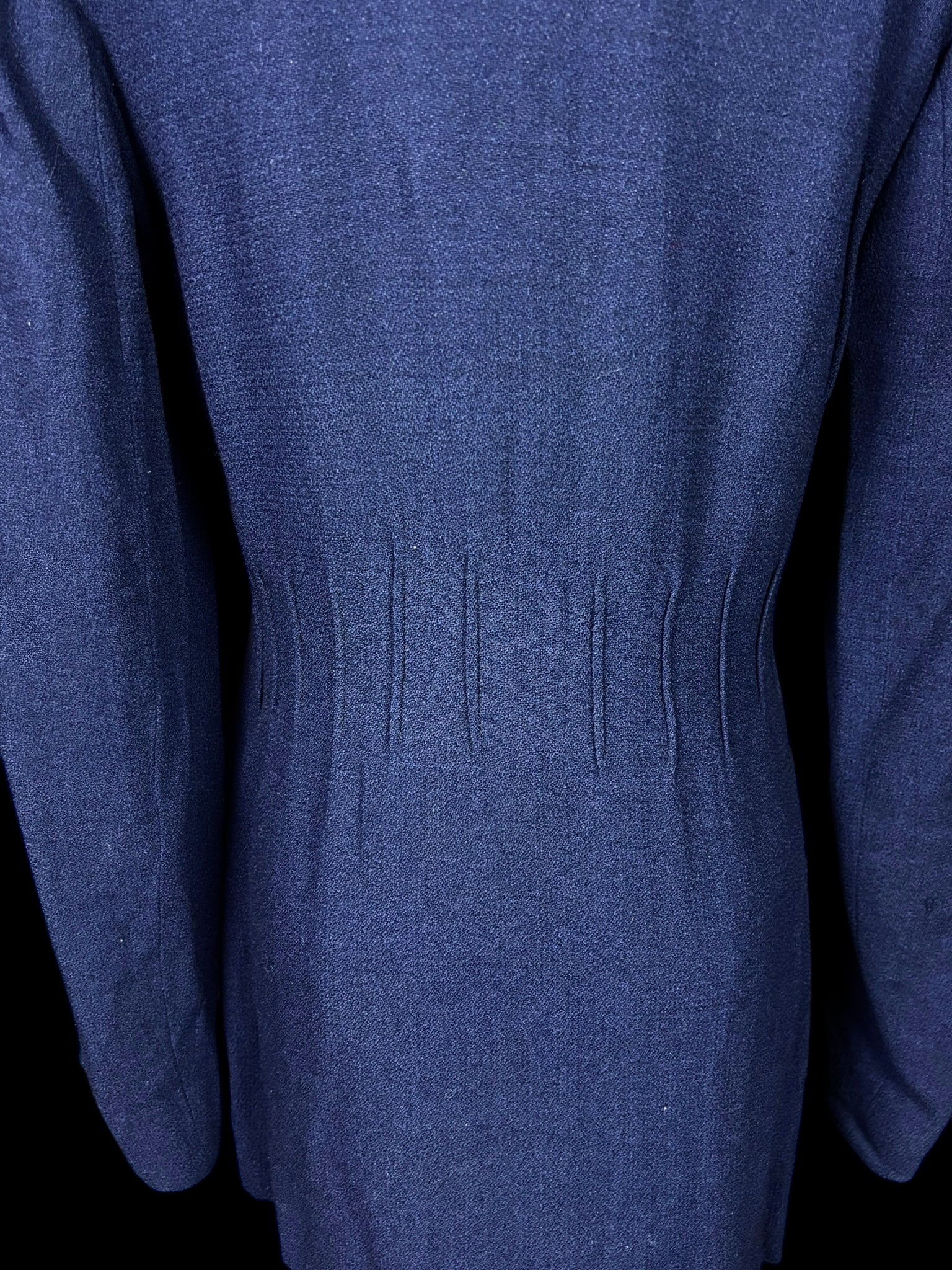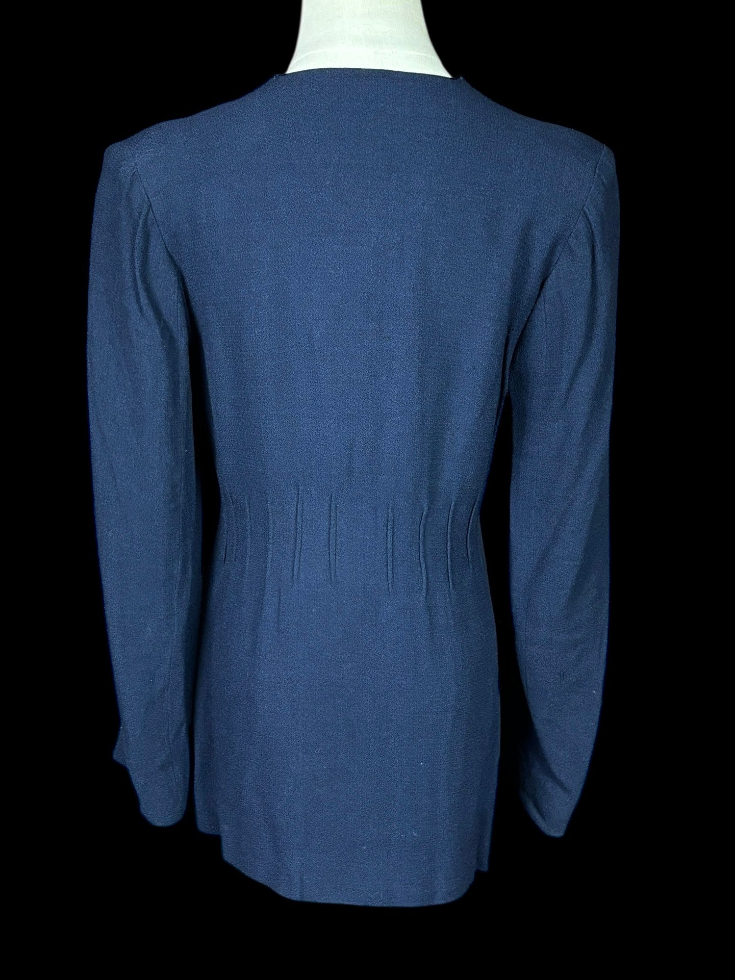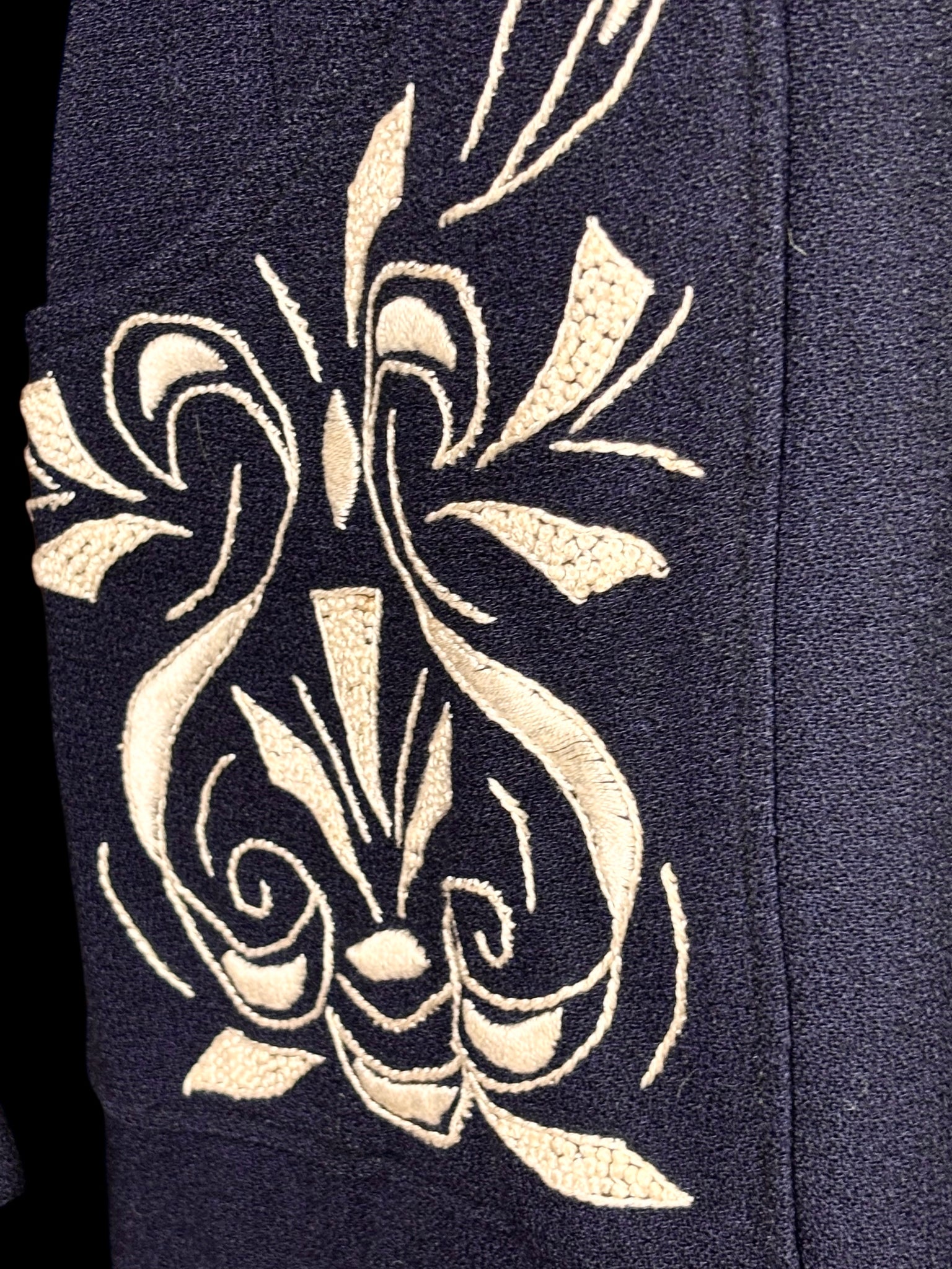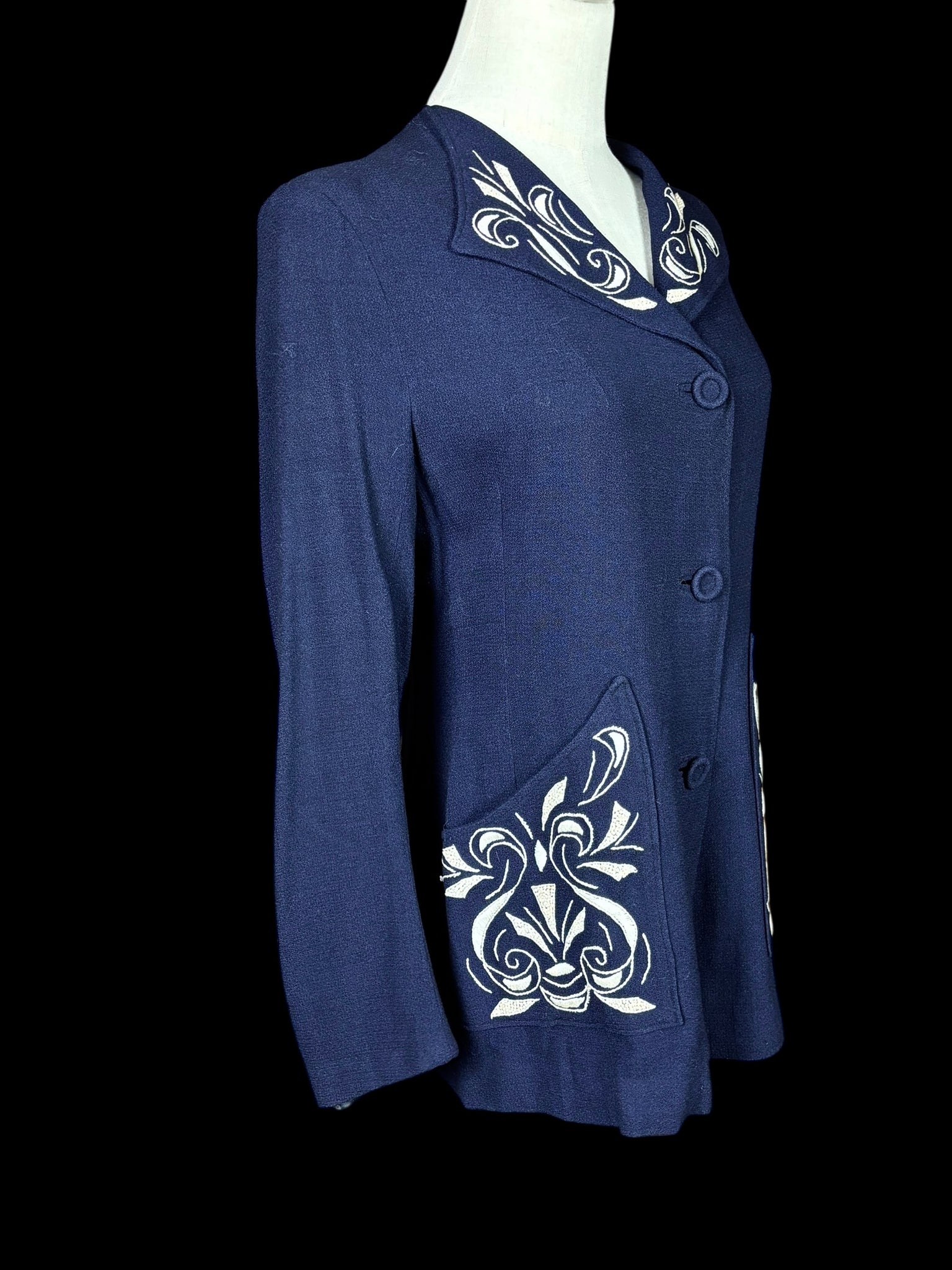 Veste années 40 faite dans un lainage bleu marine et dont le col et les poches sont brodés de coton de soie blanc. Boutons recouverts sur le devant. Très joli travail de pinces dans la ceinture au dos.